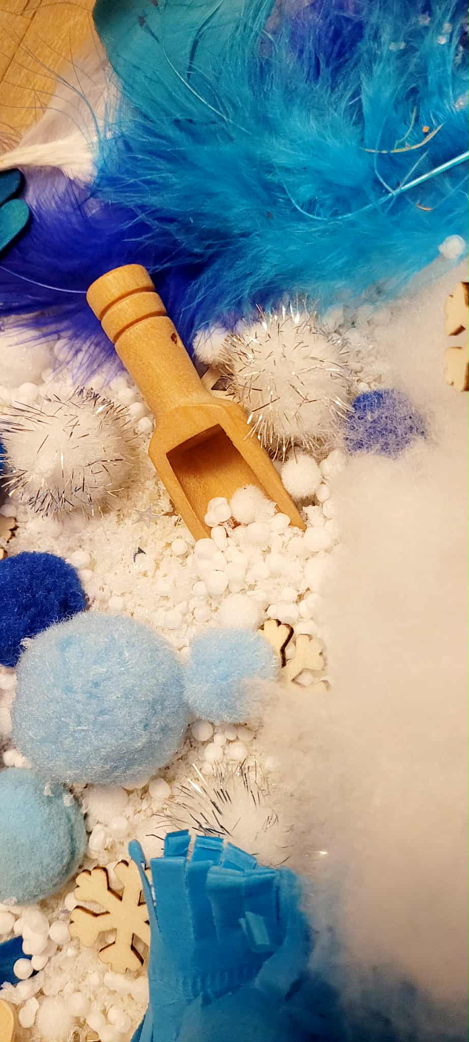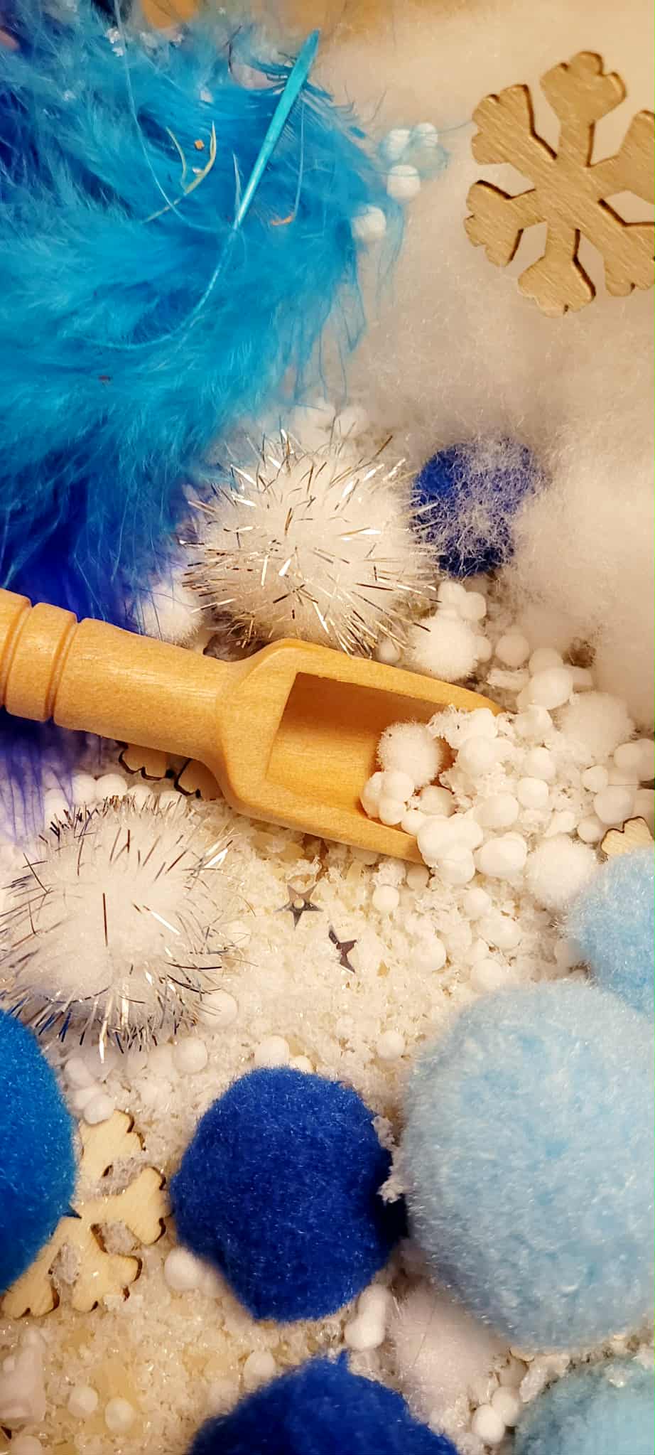 - Un ou plusieurs élément(s) de base (sable, riz, lentilles, polystyrène, mousse, terre, cailloux,...) pour encourager l'exploration au toucher.